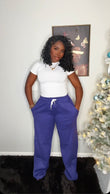 Rich purple jogger pants with a relaxed, straight-leg fit. Made from a soft, comfortable fabric, they feature an elastic waistband with a contrasting white drawstring and functional side pockets. These joggers are perfect for everyday wear, offering a bold pop of color while staying effortlessly comfortable.