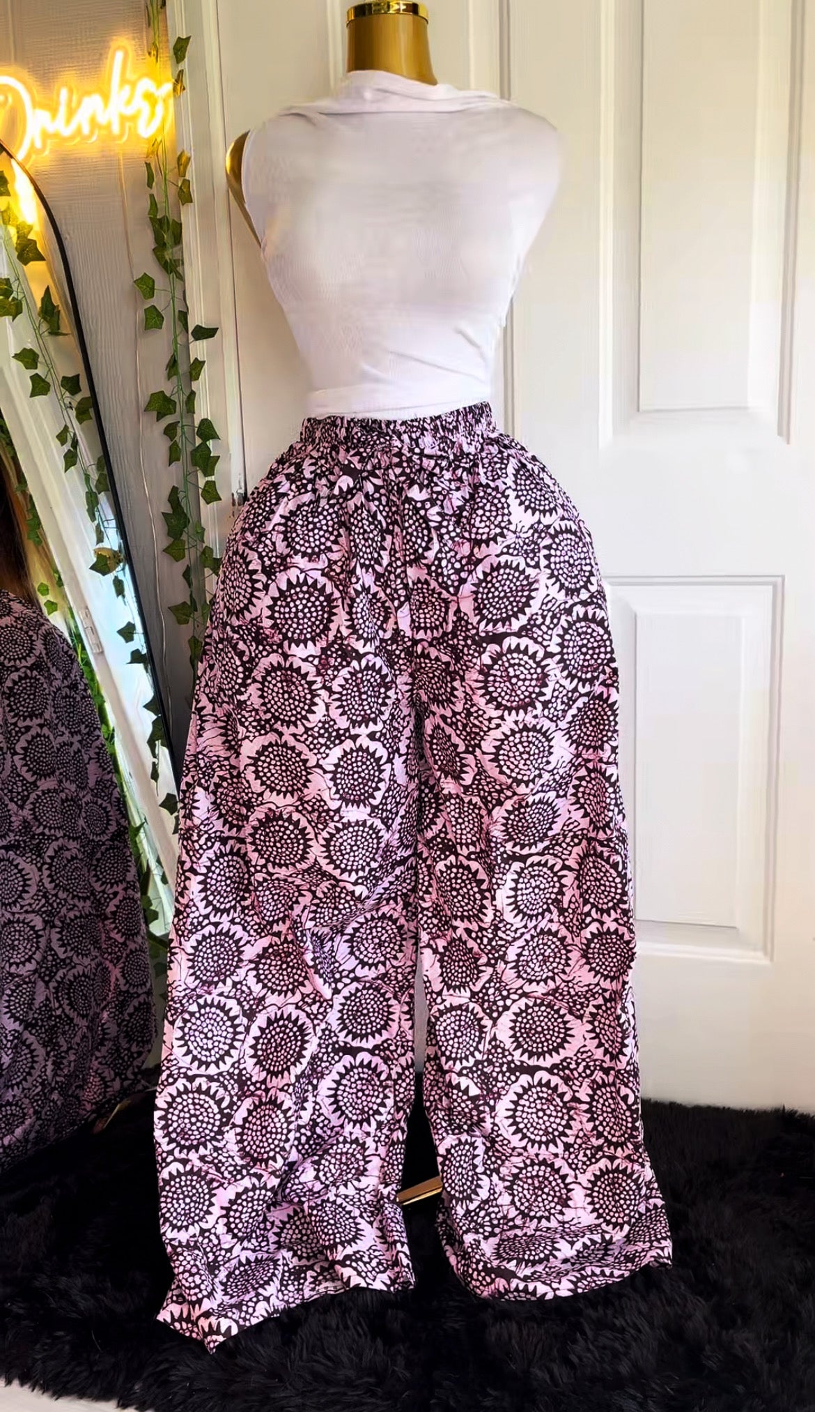 Soft, feminine, and effortlessly elevated our Blossom Luxe Palazzo Pants bring a touch of floral elegance to your wardrobe. Designed in a dreamy blush-pink base with bold, intricate black floral detailing, this piece feels both timeless and modern.
