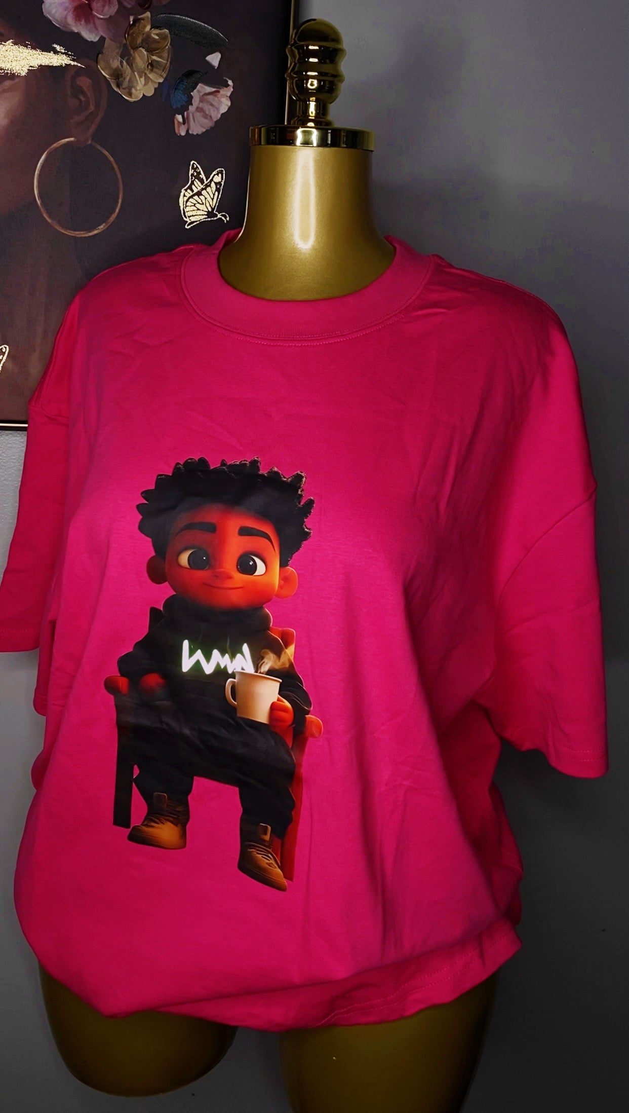 Bright, bold, and full of personality our Cool Kid Vibes Tee is the perfect mix of playful and stylish. Designed in a vibrant hot-pink shade, this oversized shirt features an adorable animated character sipping from a warm cup, giving effortless cozy-cool energy.