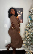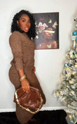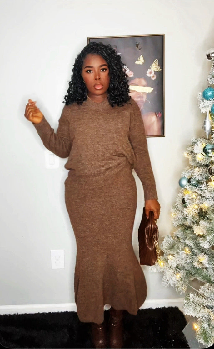 A refined, cozy-chic outfit featuring a matching mocha-brown knit sweater and midi skirt that creates a sleek, monochromatic look. The soft texture adds warmth while the fitted silhouette keeps it polished and elegant. Styled with coordinating brown boots and a classic handbag, the outfit balances comfort and sophistication perfect for a winter gathering or a dressed-up casual outing.