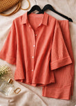 The Effortless Ease Set features a relaxed striped button-down paired with matching wide-leg pants for an easy, put-together look. Lightweight and breathable, this set is designed for effortless styling wear it together for a coordinated moment or mix and match for endless outfit options.