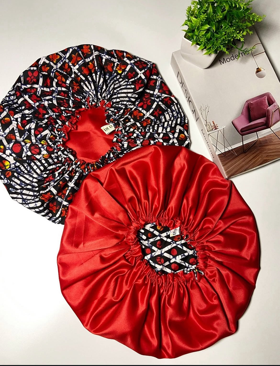 Ignite your haircare routine with elegance and flair. The Flame of Fire Bonnet features a striking blend of rich red satin and vibrant patterned fabric designed to protect your hair while turning heads.