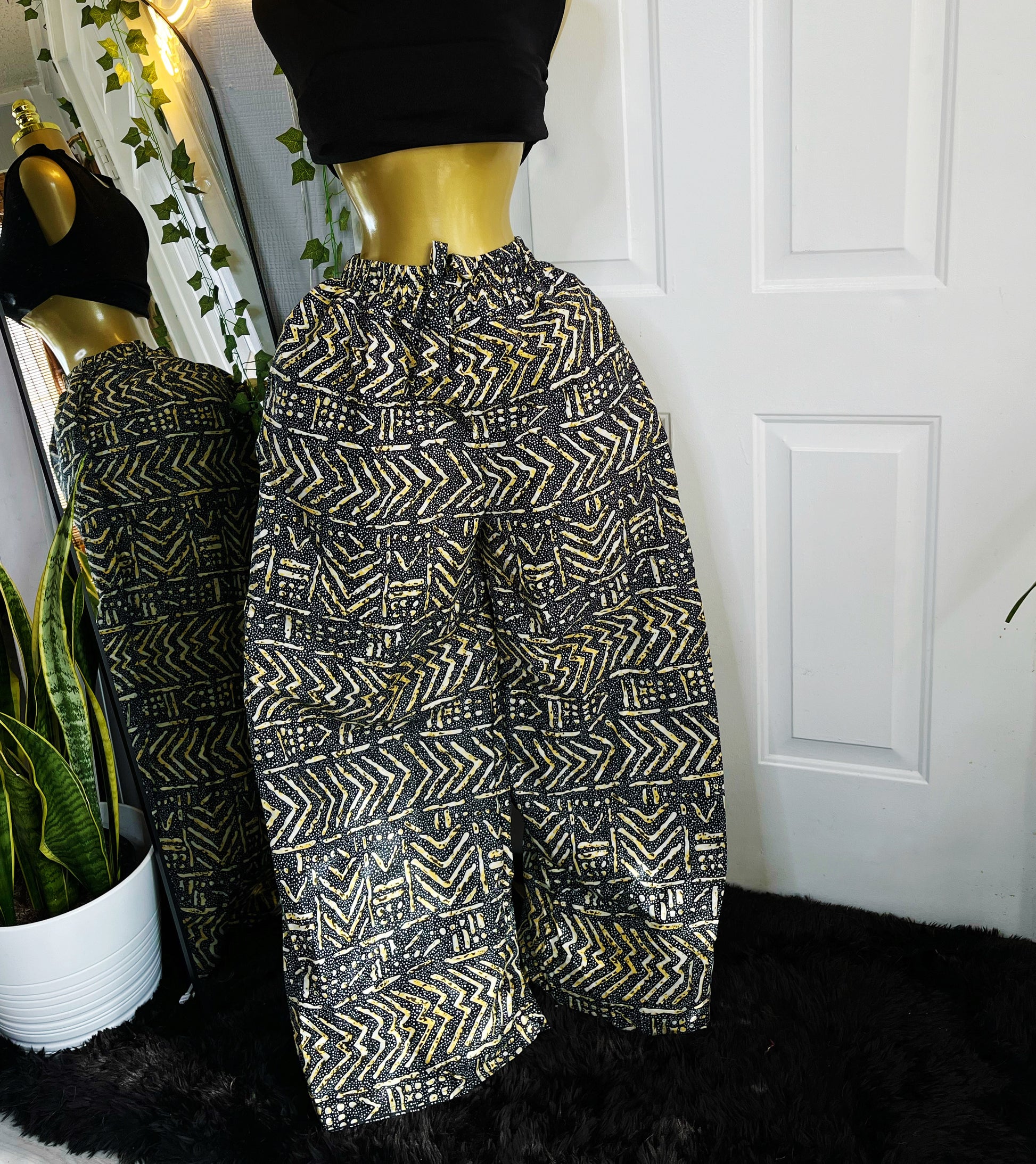 Tribal Wide-Leg Pants, designed for the woman who loves bold prints and effortless luxury. Featuring a stunning black-and-gold tribal pattern, these pants make a statement before you even say a word.