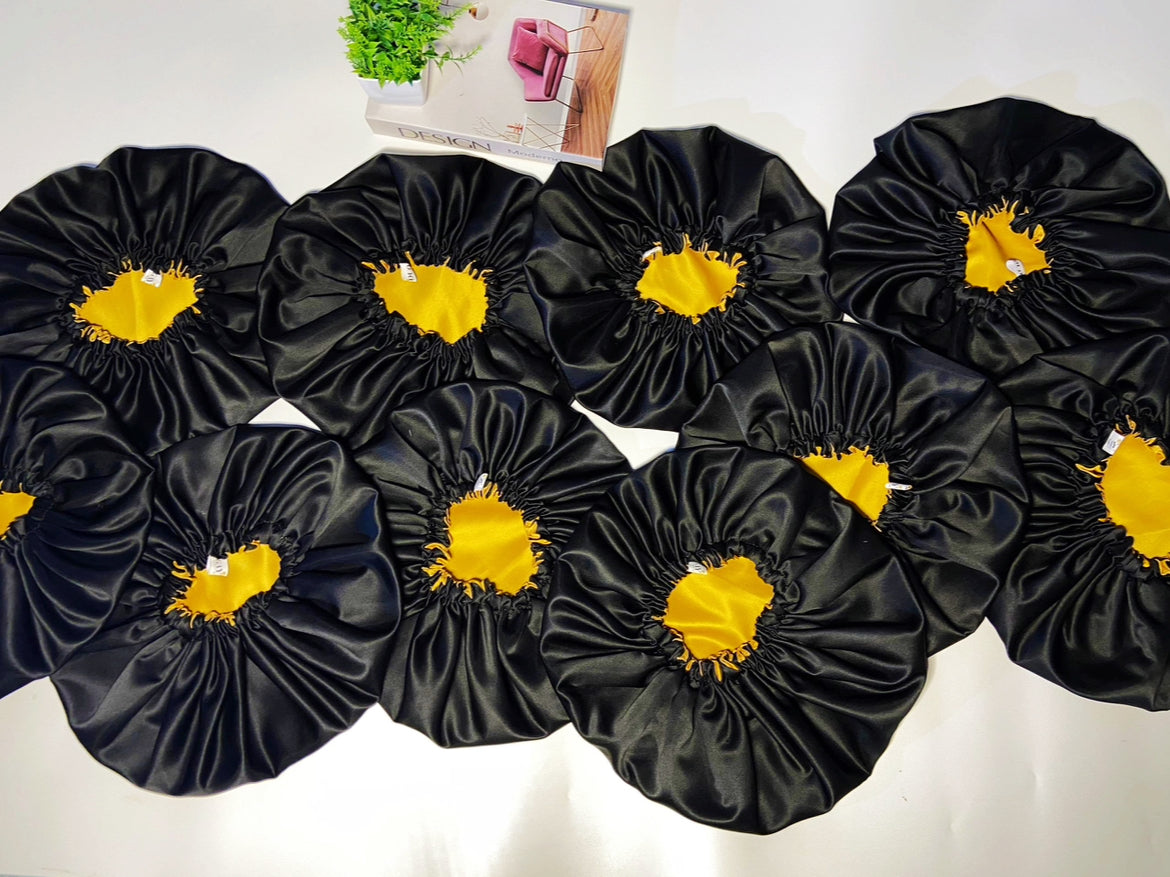 Wrap your crown in pure elegance with our Golden Royale a luxurious satin bonnet and scrunchie set crafted to protect, nourish, and elevate your hair while you sleep or style. Featuring a stunning blend of deep onyx black and rich gold satin, this reversible bonnet offers premium softness, minimal friction, and maximum shine retention.