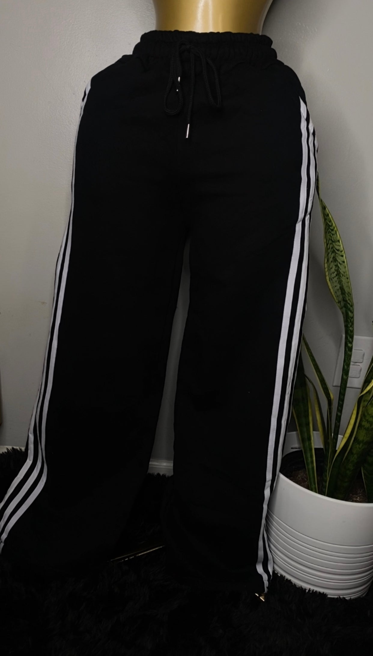 Bold, classic, and effortless our Midnight Stride Wide-Leg Joggers redefine everyday comfort. Crafted in rich black with crisp double side-stripes, these pants give you that athletic street-chic vibe while keeping it comfy with a relaxed wide-leg cut and adjustable drawstring waistband.