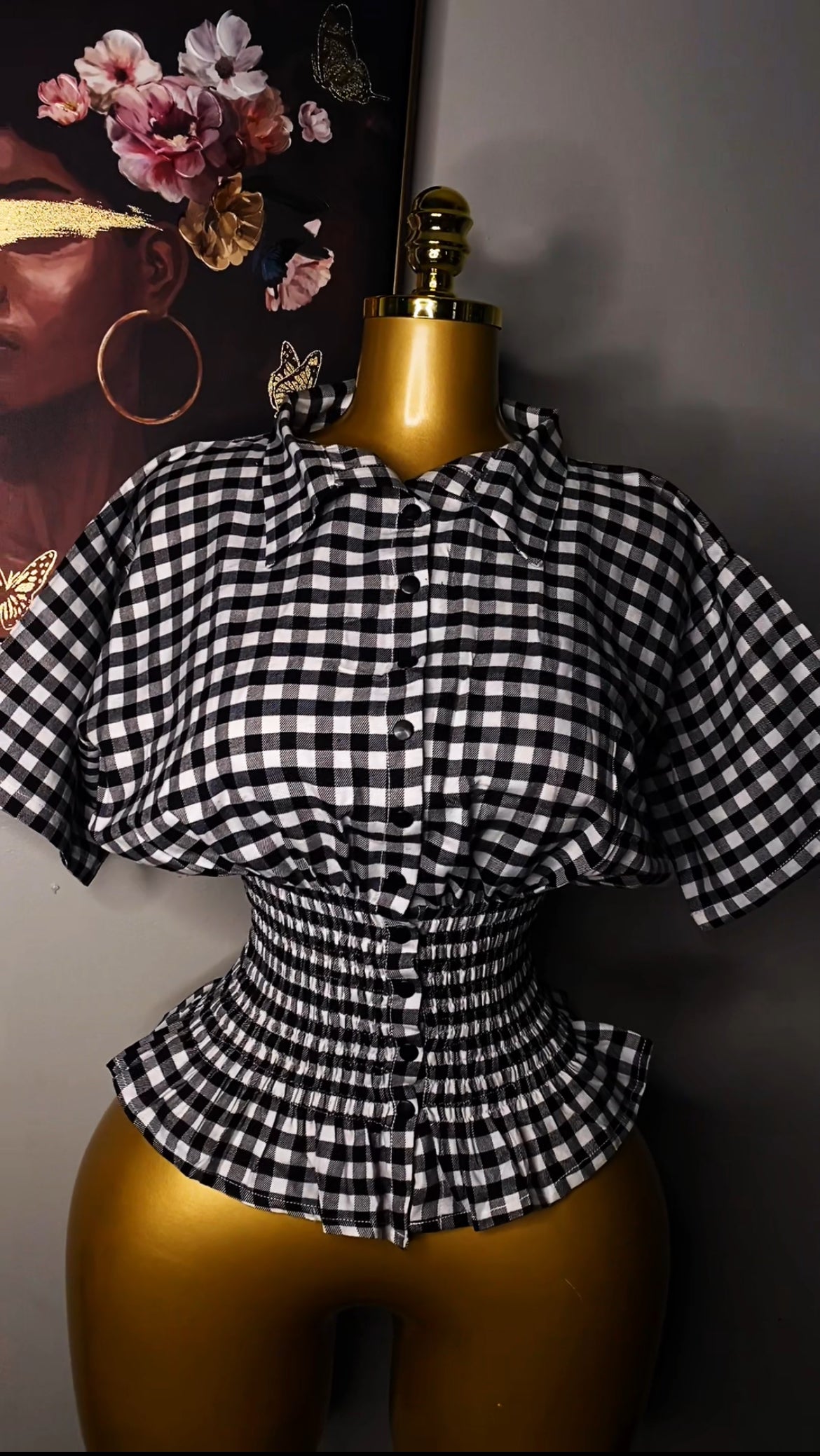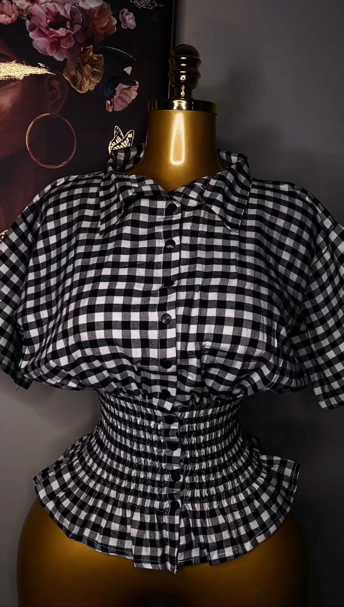 Step into effortless style with this bold black-and-white checkered blouse. Designed with a dramatic cinched waist and flared hem, it naturally snatches the waist while giving you a flattering, feminine silhouette.