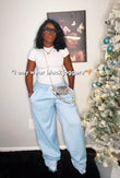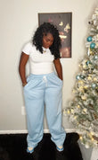 Lightweight light-blue jogger pants made from soft, breathable fabric for all-day comfort. Designed with an elastic waistband and adjustable drawstring for a secure, relaxed fit, plus side pockets for everyday convenience. The straight-leg silhouette with gently gathered cuffs gives a clean, laid-back look that’s perfect for lounging, errands, or casual styling.