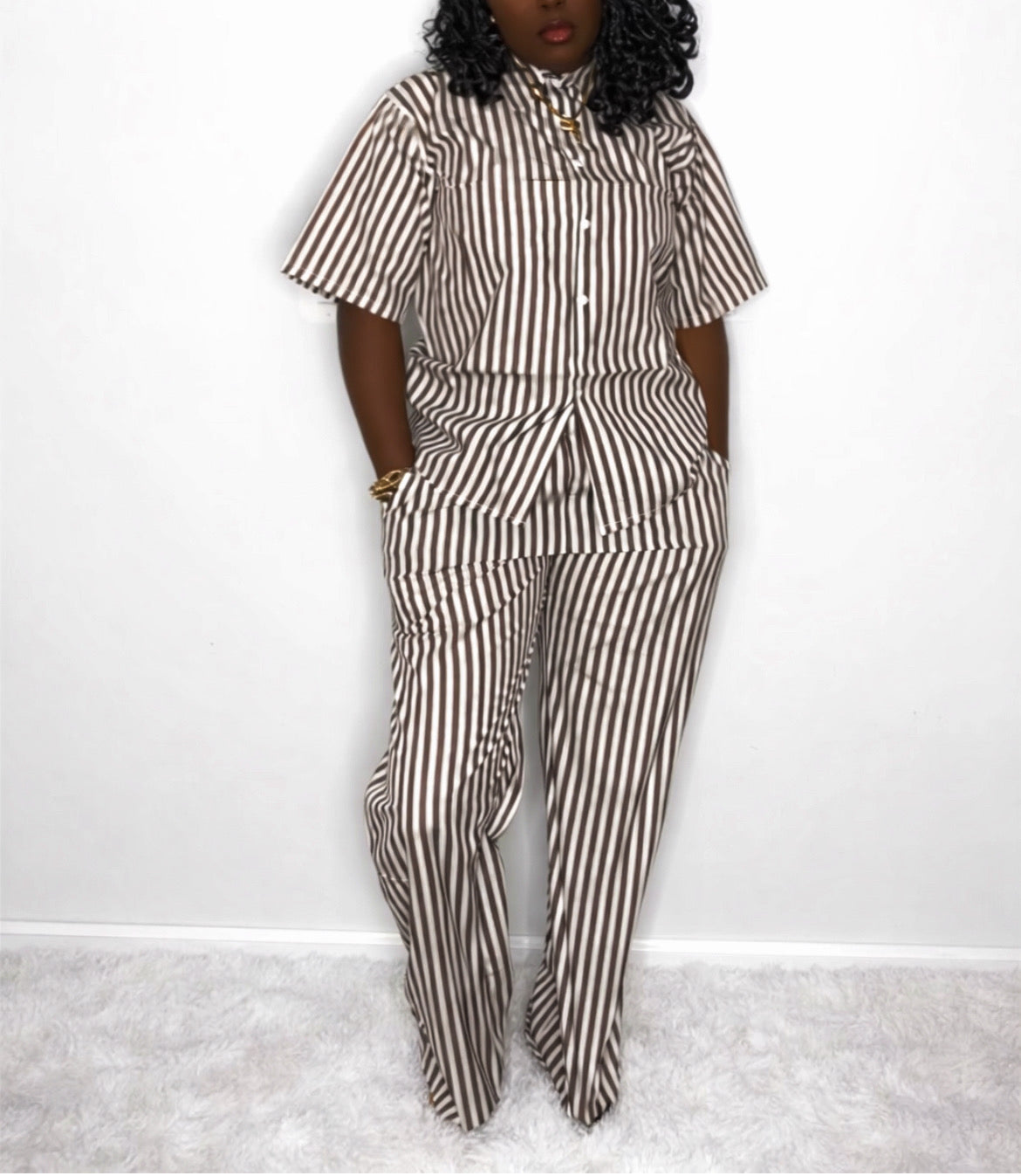 The Effortless Edit Set features a lightweight striped button-down paired with matching wide-leg pants for an easy, polished look. Designed to be worn together or styled separately, this set transitions seamlessly from casual to elevated.