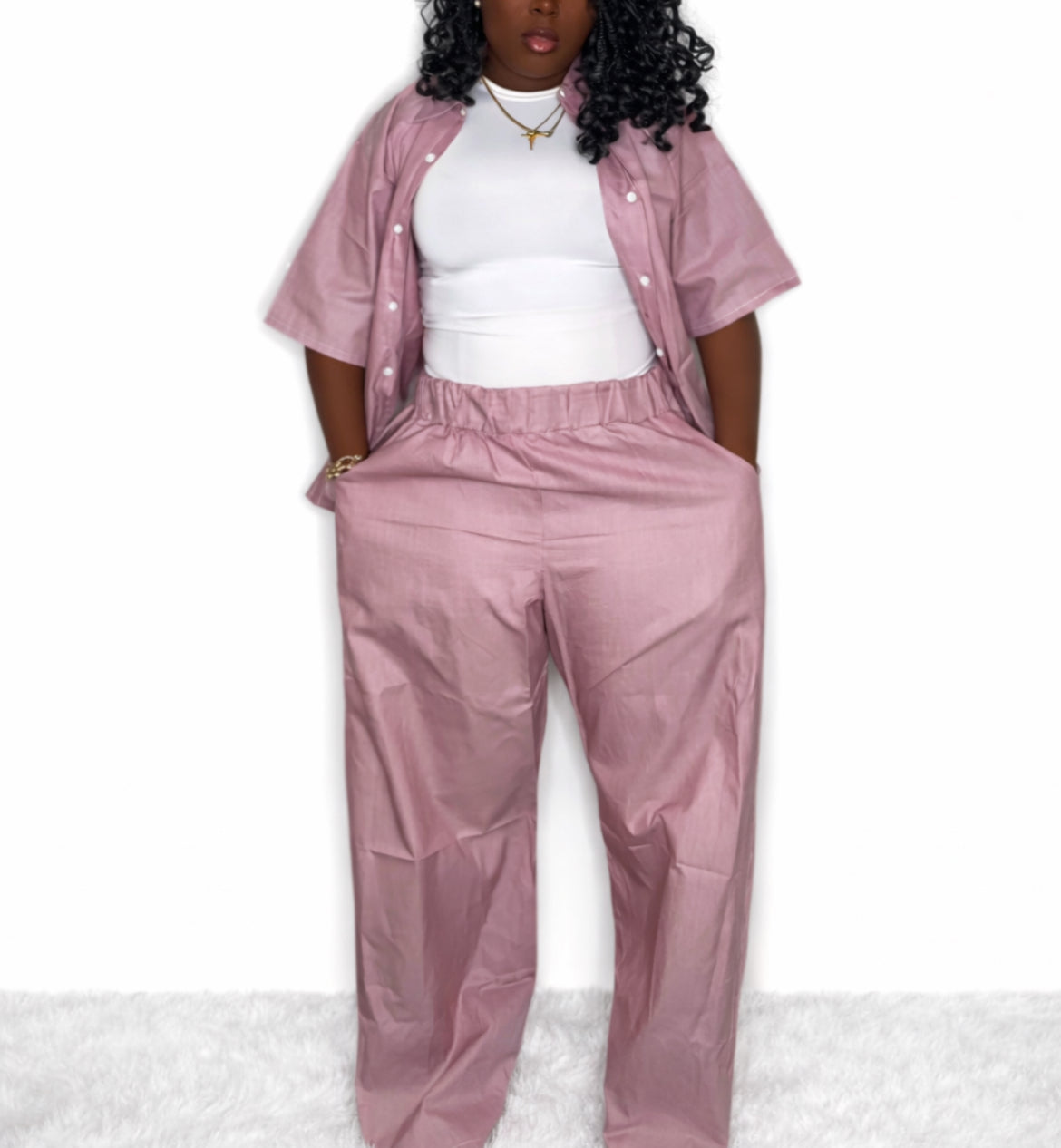• 2-piece set (button-down shirt + wide-leg pants)