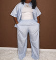 - 2-piece set (button-down shirt + wide-leg pants)