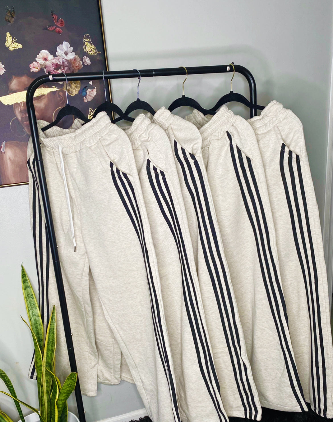 Meet your new everyday essential the Urban Stride Wide-Leg Joggers. Designed with a soft heather-grey fabric, adjustable drawstring waist, and bold double-side stripes, these pants blend comfort with a sporty-chic edge. The wide-leg silhouette gives you effortless movement, while the premium feel keeps your look elevated whether you’re running errands, traveling, or dressing down in style.